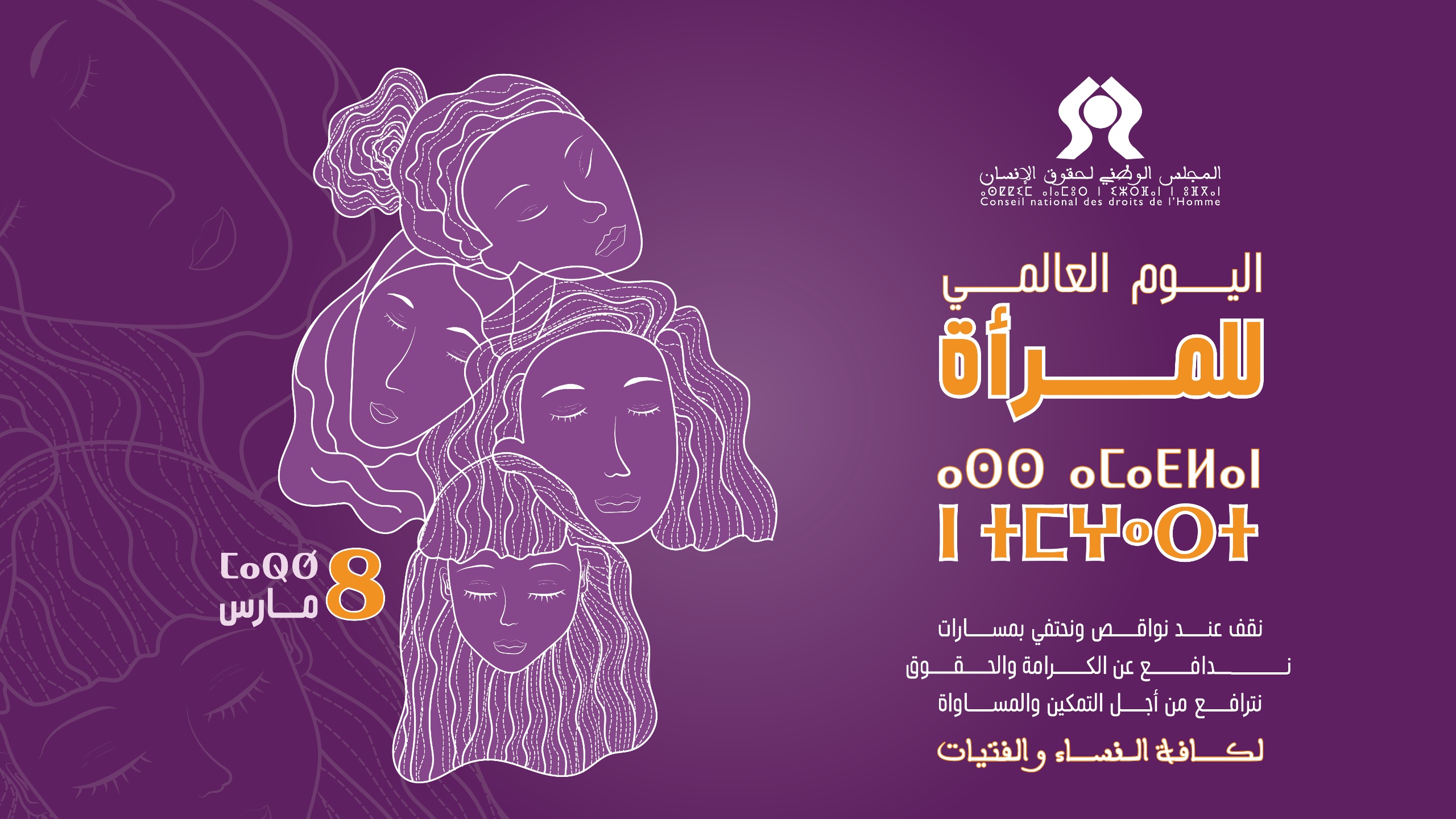 بمناسبة اليوم العالمي لحقوق المرأة 2026، يدعو المجلس الوطني لحقوق الإنسان جميع شركائه والفاعلين لإعمال شعار هذه السنة (حقوق. عدالة. عمل. من أجل جميع النساء والفتيات)، الذي ينخرط فيه، وجعله التزاما مشتركا ومتواصلا ضد كل المقتضيات التمييزية والحواجز التي تعيق تمتع المغربيات، نساء وفتيات، بكامل بحقوقهن.