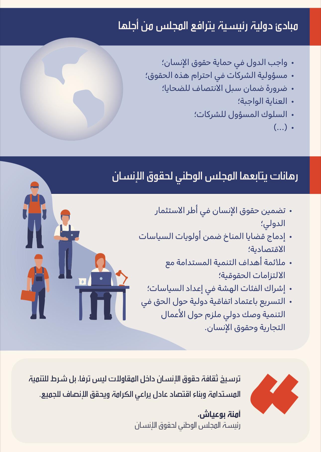 L'ancrage de la dimension des droits de l'Homme et l'engagement à respecter ces droits dans les entreprises sont à même de garantir un travail décent, exempt de discrimination, respectueux de la dignité humaine, en totale conformité avec les normes internationales pertinentes. « La richesse des ressources naturelles et humaines dans les régions arabes et africaines nous incite à développer des modèles de développement qui prennent essence des spécificités locales et se basent sur le respect des droits de l'Homme et la dignité humaine, tout en incitant les entreprises à s'engager efficacement et à impliquer les sociétés dans l'évaluation de l'impact des projets sur les droits de l'Homme, a ajouté la présidente de l'Institution nationale des droits de l'homme du Maroc.