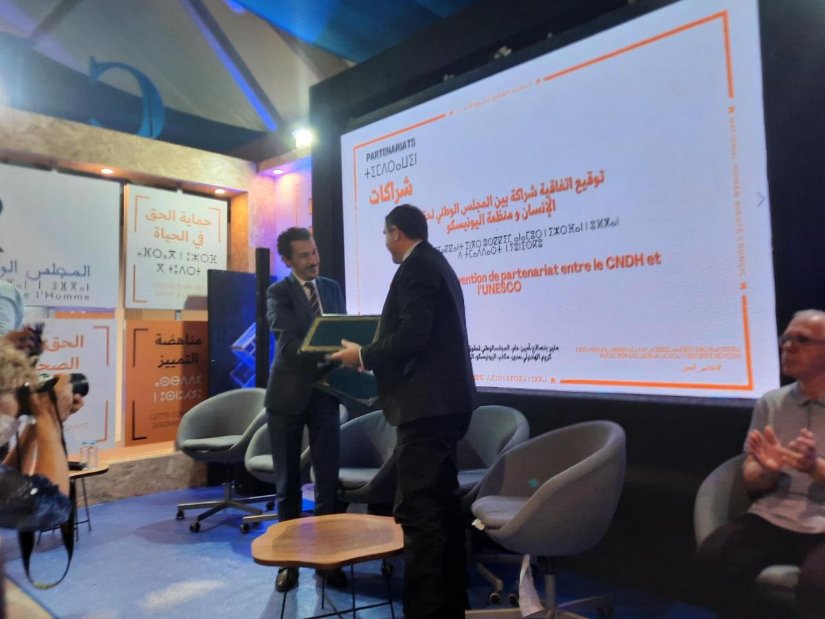 وقع المجلس الوطني لحقوق الإنسان ومنظمة اليونسكو، يوم الإثنين 6 يونيو 2022 برواق المجلس بالمعرض الدولي للنشر والكتاب بالرباط، اتفاقية شراكة للنهوض بالتربية على المواطنة وحقوق الإنسان، عدم التمييز والدمج الاجتماعي.