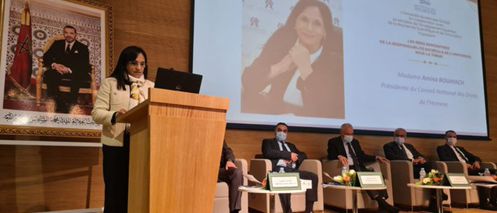 شاركت السيدة آمنة بوعياش، رئيسة المجلس الوطني لحقوق الإنسان، يومه الإثنين 14 فبراير 2022، في افتتاح مناظرة وطنية حول "المسؤولية المجتمعية للجامعة: من أجل حياة جامعية دامجة ومندمجة"، بكلية الطب والصيدلة-جامعة عبد المالك السعدي بطنجة.