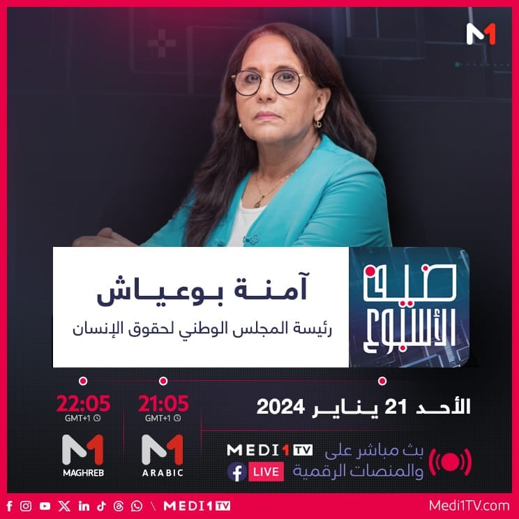 حلت رئيسة المجلس الوطني لحقوق الإنسان، السيدة آمنة بوعياش، مساء يوم الأحد 21 يناير 2024 ضيفة على برنامج "ضيف الأسبوع" الذي يقدمه الإعلامي نوفل العواملة بقناة ميدي1 تي في، وبحضور الأستاذ نوفل البوعمري، محامي وفاعل حقوقي.