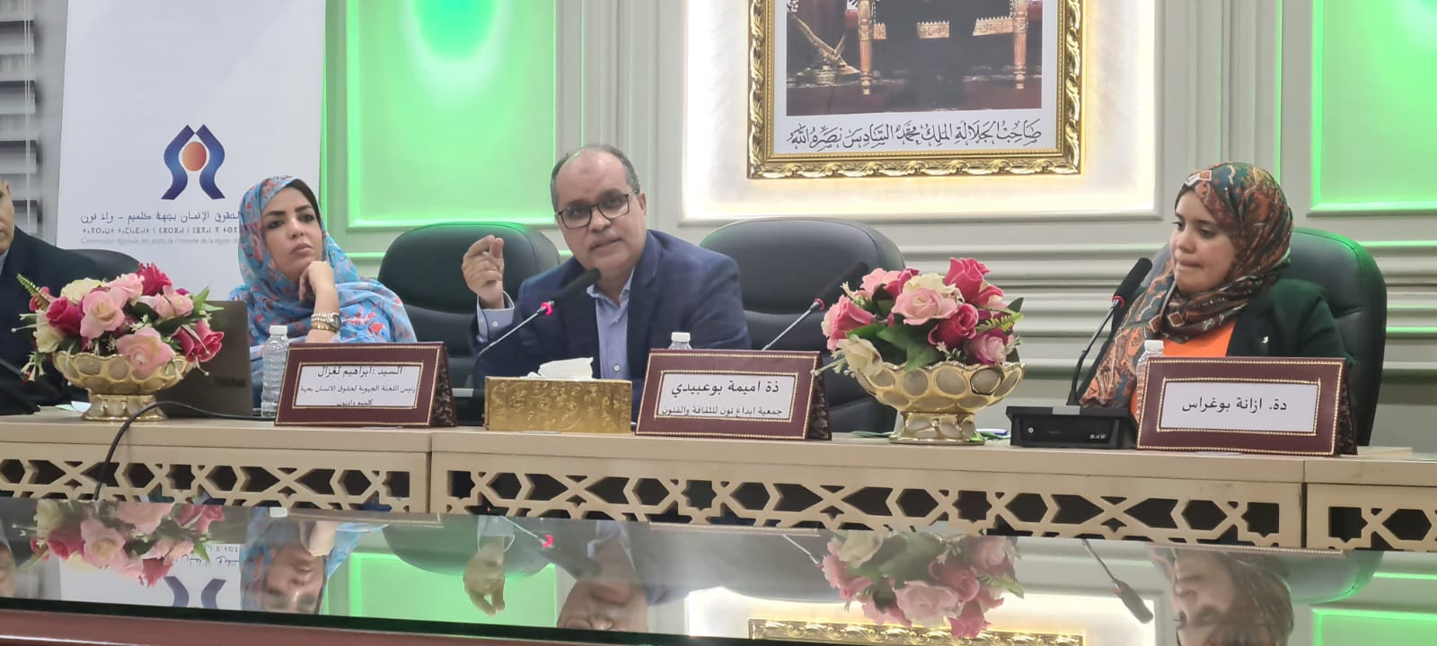 نظمت اللجنة الجهوية لحقوق الانسان بجهة كلميم-واد نون بشراكة مع جمعية إبداع نون للثقافة والفنون، مساء الجمعة 31 ماي 2024، ندوة فكرية حول موضوع: "أي أدوار للفن من أجل النهوض بثقافة حقوق الانسان وترسيخها؟" بقاعة الاجتماعات بالغرفة الفلاحية بكلميم.