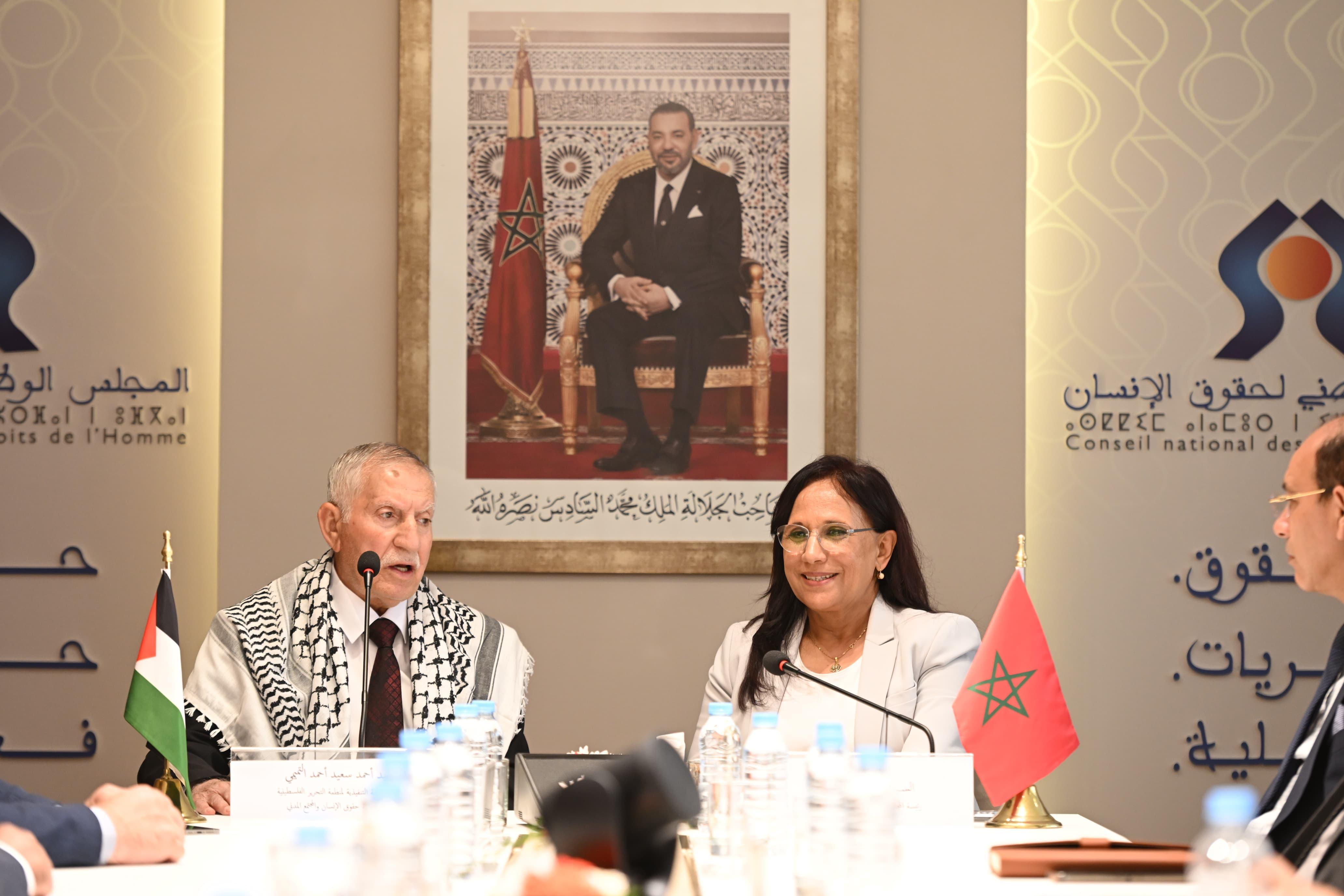 Pour sa part, M. Ahmed Saad Al-Tamimi a salué l'engagement du Royaume du Maroc à défendre la cause palestinienne, les positions du Maroc, du Roi et du peuple, ainsi que la place qu'elle occupe dans leur cœur. Le Chef de la délégation palestinienne a salué aussi le soutien continu du Maroc, du CNDH et de sa présidente, Mme Amina Bouayach, dans les instances internationales des droits de l’Homme.